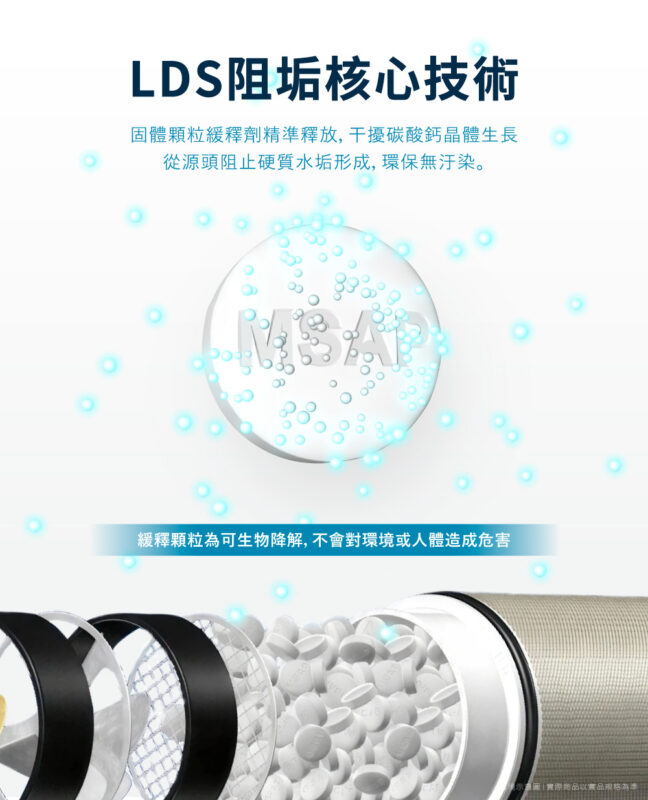 LDS 技術透過濾芯中的特殊介質,對流經的水流產生低密度電訊號場,使水中的鈣鎂離子在通過濾芯時改變結晶方式:不再形成針狀或片狀、容易卡住的結晶,而是形成圓潤、不易附著的鈣鎂微晶,自然隨水流排出,不黏附於熱水器、洗衣機、水龍頭等設備內部。
