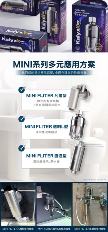 | 微型過濾軟化器 | 體積小、免插電、價格好負擔 | 定期更換濾芯 | 智能馬桶、蓮蓬頭、熱水器 |