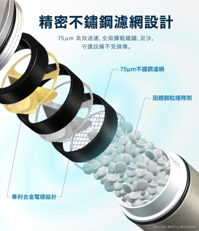 除了抑垢,微型過濾軟化器也兼顧「顆粒雜質」對設備的傷害。內建的精密不鏽鋼濾網(75 μm)可有效攔截鐵鏽、泥沙、懸浮微粒,避免噴孔堵塞、閥件卡砂、熱水設備效率下降等問題。
