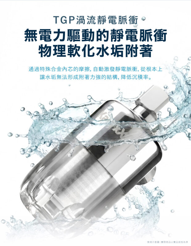 | 物理軟化(抑垢) | 降低水垢在表面的黏附與堆積 | TGP 渦流靜電脈衝:無需插電,水流與合金內芯作用 |